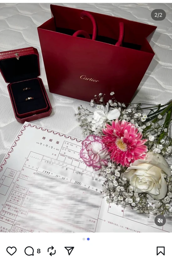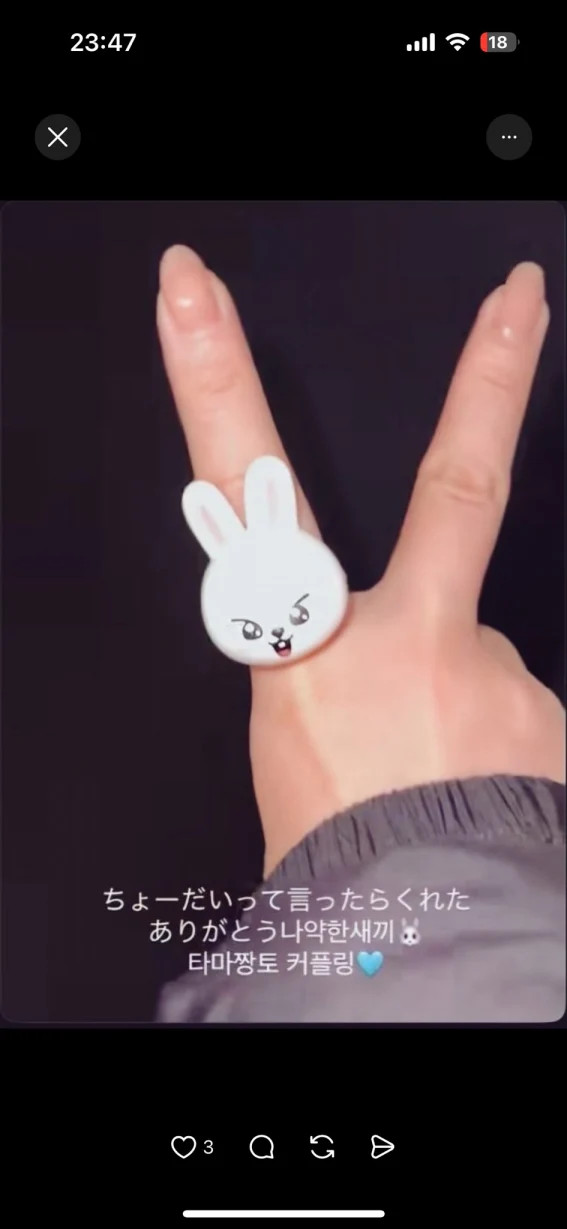 この女性はInstagram写真で、お揃いのサングラスを着用。「リノ」のキャラグッズであるリングを身に着ける姿もみられている。キャプションには「ちょーだい、と言ったらくれた」とし、ハングルで「ありがとう。タマチャンとカップルリング」と綴っている。韓国人からもらったもの?