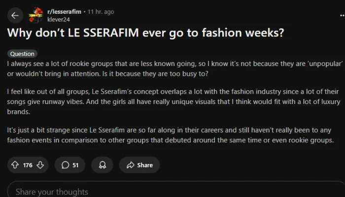 Redditでも6日、「なんでルセラは、ファッションウィークに行かないの?」とのポストが話題に。考えられる理由として、「忙しいから」「事務所が活動に専念する方針だから」といった点があがっています。