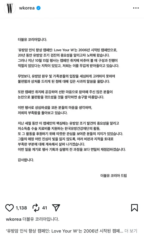 イベントから4日経った19日、謝罪文を発表。「W Korea」は「キャンペーン趣旨に照らしてみると構成と進行が適切でなかったという指摘を重く受け止めている」とし、「乳がん患者と家族の方々の立場を細心に考慮できず不便と傷を与えた点」「キャンペーン趣旨に共感し善良な心で参加して下さった多くの方々」に申し訳ないと伝えました。