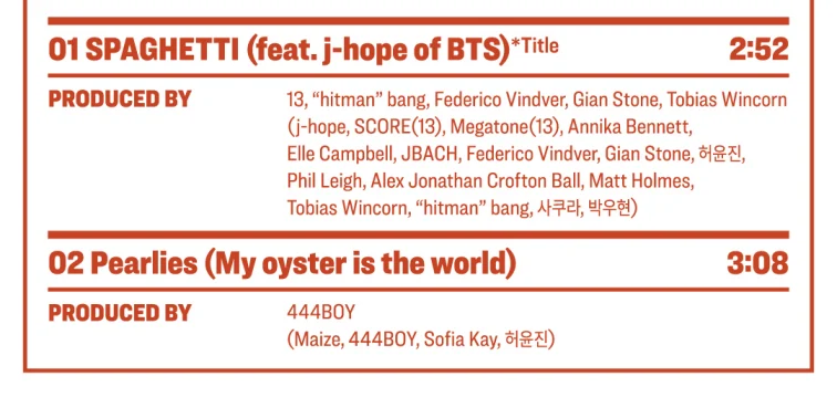 1stシングルアルバム「Spaghetti」(スパゲッティ)には、タイトル曲「Spaghetti(feat. j-hope of BTS)」と「Pearlies(My oyster is the world)」の2曲が収録。10月24日13時リリース。