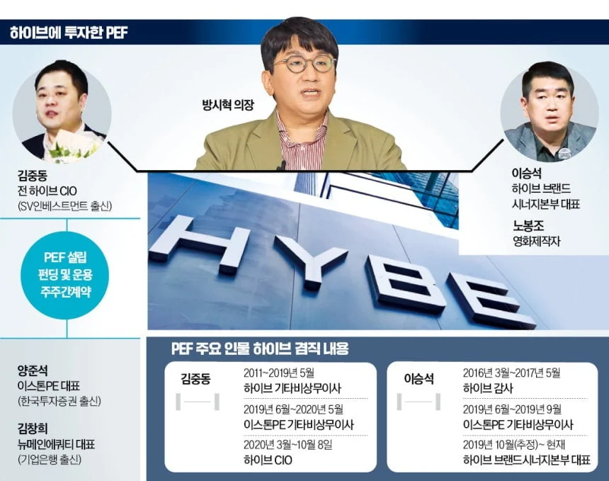 元CIOとパン氏の関係は、ビッグヒット時代にさかのぼる。ガールズグループ「GLAM」の失敗で苦境にあった際には、サポートし、パン氏の信頼を得た。2018年末にHYBE共同創業者であるチェ・ユジョン副社長が、持株を売りたがっているという話を聞き、PEF設立プロジェクトを計画。パン議長は、個人資産の運用も、同氏の助言に従うほど信任していたという。