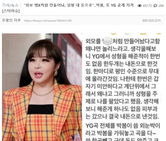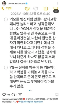 2NE1「パク・ボム」(41)が22日、YGヤン・ヒョンソクに対する告訴状をアップし、天文学的な金額を要求。それは削除されたが、投稿を続けている。