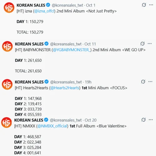 ちなみに最近カムバックした競合グループをみると、NMIXXは「46万枚」, 新人Hearts2Heartsは「14万枚」, Babymonsterは「26万枚」, iznaは「15万枚」。新譜は20種類以上で発売されたが、「izna」をも下回っています。
