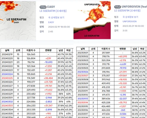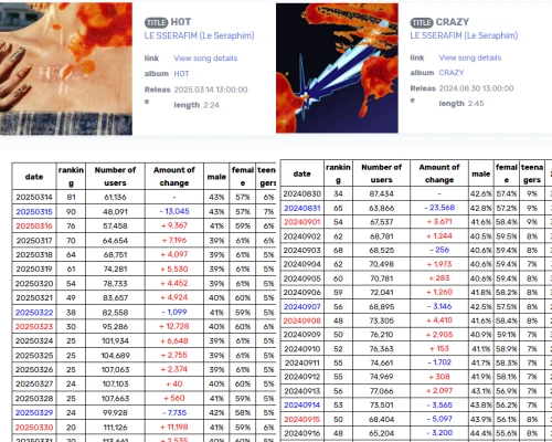 こう見ると、カムバックの度に、初日順位を落としている。落ち込みが激しいのは、「Crazy」→「HOT」で、急落している。2024年には、コーチェラやNewJeans(ミンヒジン)のスキャンダルが発生。その影響を受けたものと見られます。