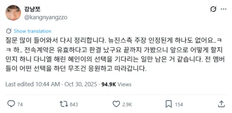 このファンは「質問がたくさん入ってきたので、もう一度整理します」「NewJeans側の主張で認められたのが一つもないですㅋㅋ」「専属契約は有効だと判決されましたし、最後まで行ってみたので、これからどうするか」「ミンジ・ハニ・ダニエル・ヘリン・ヘインの選択を待つことだけが残ったようです。私はメンバーたちがどんな選択をしても、無条件に応援してついて行きます」。