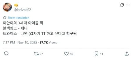 10日、ヨントンが開催。ここで、ファンから「第3世代アイドル」の中の推しを尋ねられたそう。イアンはBlackPink「ジェニ」, TWICE「ナヨン」をあげたそう。「急にTTしたい」とも言ったそう。