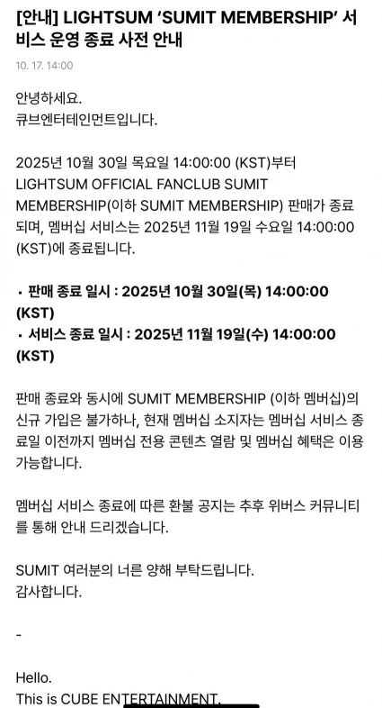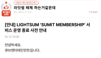 最近、「Lightsum」がファンクラブ「運営終了の事前案内」を告知。「メンバーシップサービスは2025年11月19日に終了します」と発表。メンバーシップの販売はすでに10月30日に終了しており、サービス終了を控えている。
