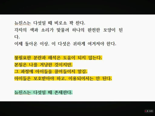 ミン氏は「NweJeansは5の時に存在する」「最初から5を置いて絵を作った。外見、音、色、スタイル、動線まで全て5つを前提に設計された構造だった。それで人々が熱狂し、それで形が完成した」「NewJeansは5でようやく完成する。それぞれの色と音がかみ合って、一つの完全な形になる。今帰ってきた以上、この5人は大事にされるべきだ」と、完全体復帰を支持。