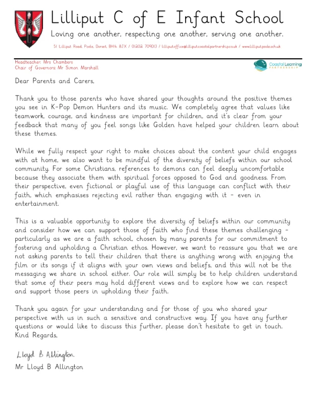 現地メディアなどによると、禁止したのは、イギリス南西部プールにある「キリスト教幼児学校」(Lilliput Church of England Infant School)。14日、保護者に向けて「学校共同体の一部がKPop Demon Huntersの歌に登場する『Demon』に対して非常に不愉快に感じている」という内容の文書を伝えたという。