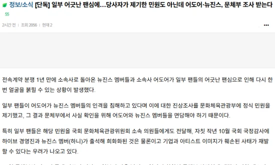 文化体育観光部の長官室には16日から17日まで、大量の苦情ファックスが送られた。送信主は、NewJeansのファン達。ファックスには「所属歌手を保護する義務がある所属事務所が理解できない行動でメンバーを苦しめている」「Adprがマスコミと癒着して悪意的な世論を作っている」「一方(ヘリン·ヘイン)を支持し、メンバー同士に不和が生じる雰囲気を作っている」と書かれていた。