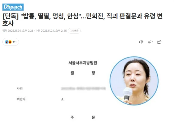 11月24日も、Dispatchが「ミン・ヒジンの(正体不明の)法律代理人(幽霊弁護士)が「ディスパッチ」に記事訂正を携帯メールで要請した」との記事を掲載していました。