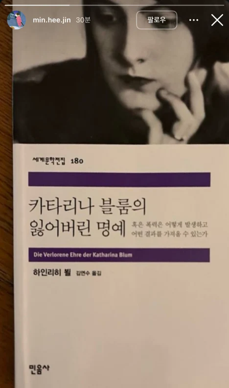 ミン・ヒジン」が24日、Instagramストーリーを更新。本の写真をアップしています。ノーベル賞作家ハインリッヒ・ベルによる「カタリーナの失われた名誉」の表紙です。