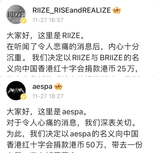 RIIZE公式Weiboチャンネルは「悲しい知らせを聞いて心が非常に重かった」「『RIIZE』と『ブリズ(ファンクラブ名)』という名で香港赤十字に25万香港ドル(約500万円)を寄付することに決めた」「すべてが安全であることを願う」と明らかにしました。
