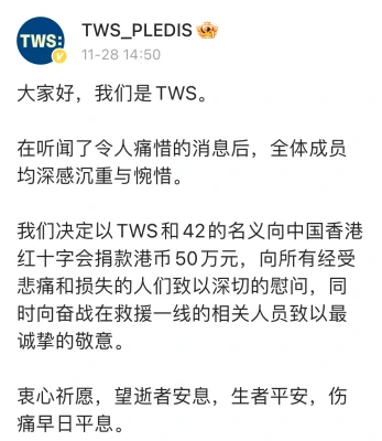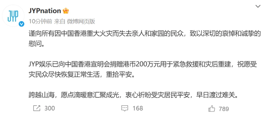 JYPエンターテインメントも、Weiboを通じて「香港の大きな火災で愛する人と家を失ったすべての人々に深い哀悼の意を表する」「緊急救助および災難後再建のために中国ビジョン香港に200万香港ドル(4,000万円)を寄付した」。