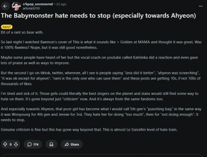 こういった賛否の声は、英語圏のK-POPファンの間でも見られているよう。Redditでは「The Babymonster hate needs to stop (especially towards Ahyeon)(ベビモンへのヘイトはストップすべき(特にアヒョン))」とのポストがトレンド。こういったポストが投稿されるほど、否定的な反応が多いことがうかがえる。