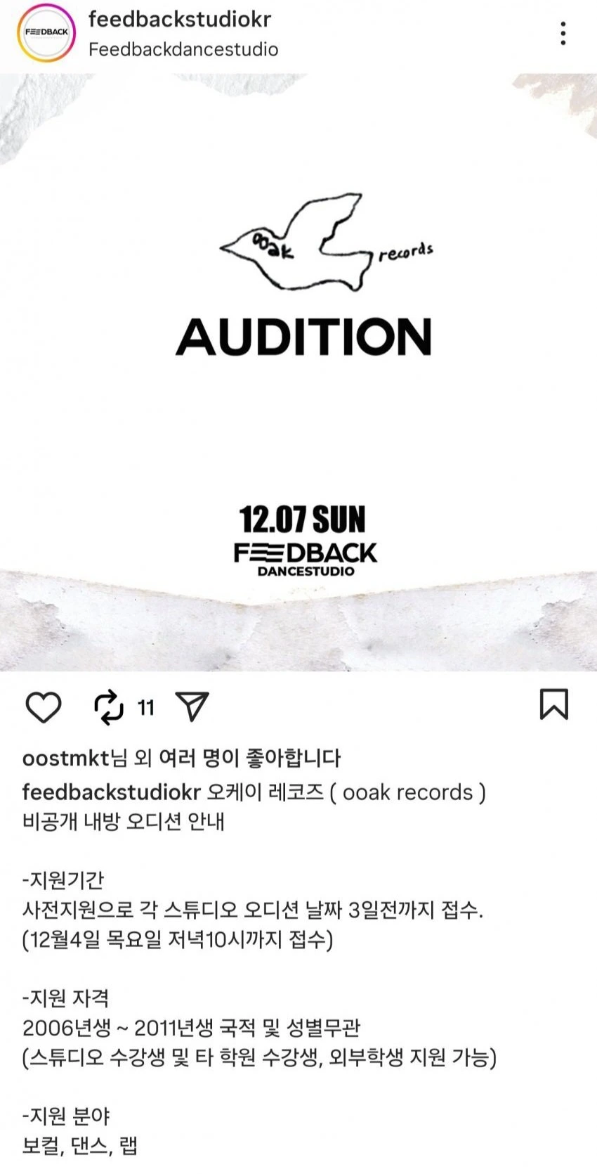 韓国メディアによると、「ooakレコード」は7日、有名ダンススタジオで非公開オーディションを行う予定だという。応募は4日22時までで、志願資格は2006年生~2011年生(13歳~19歳)、国籍・性別は不問。募集分野はボーカル、ラップ、ダンスとなっており、アイドルを念頭に置いているものと見られる。
