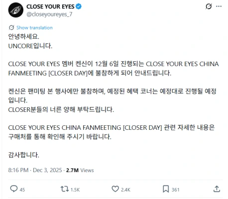Close Your Eyes日本人メンバー、中国ファンミ不参加に…日中関係悪化、K-POPにも飛び火