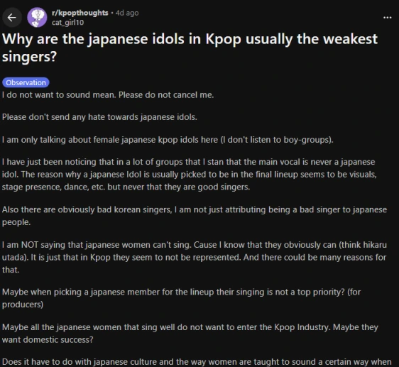 こういった状況に、海外K-POPは「なんで日本人メンバーは、歌えない人が多いんだろう」との印象を持つ人も少なくないよう。Redditでは最近、「Why are the japanese idols in Kpop usually the weakest singers?(K-POPの日本人アイドルは、なんでいつも歌が下手なのか?)」とのポストがトレンド入り。議論を呼び起こしています。
