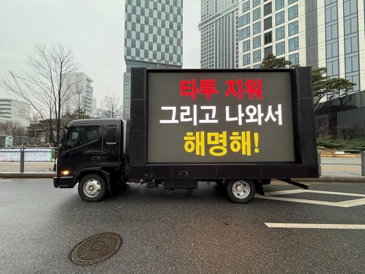 SM社屋前に登場したトラックには、熱愛を批判する文言が。「今ウィンターがした行動で傷つくのは自身のファンだということを知ってほしい」「沈黙は答えではない、出てきて責任感を見せろ」「タトゥーを消して出てきて釈明して」、「恋愛したいならaespaウィンターではなく一般人のキム・ミンジョンとして生きろ」。