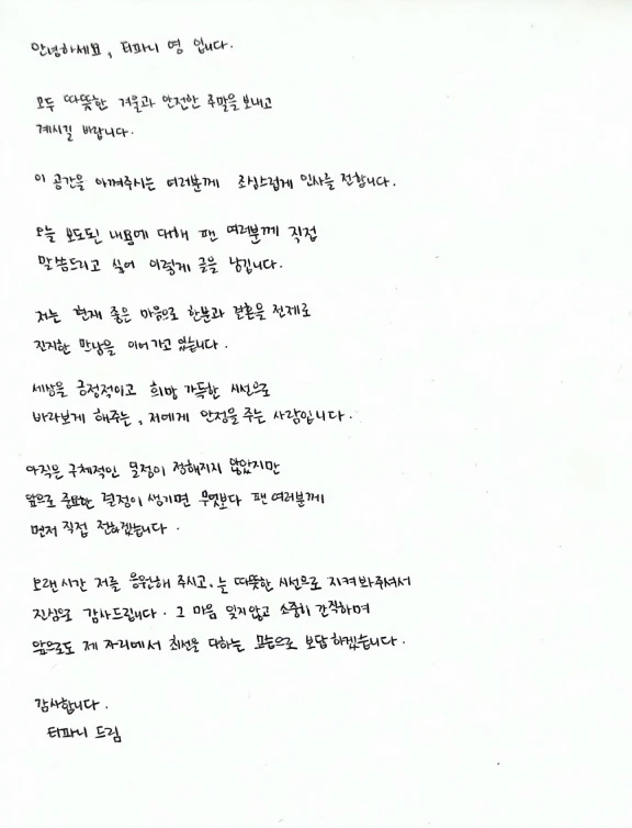 続けて「まだ具体的な日程が決まっていないが、今後重要な決定が生じればファンの皆さんに先に直接伝える」「応援して下さり温かい視線で見守って下さって感謝する。その気持ちを忘れずに大切にし、自分の席で最善を尽くす」。