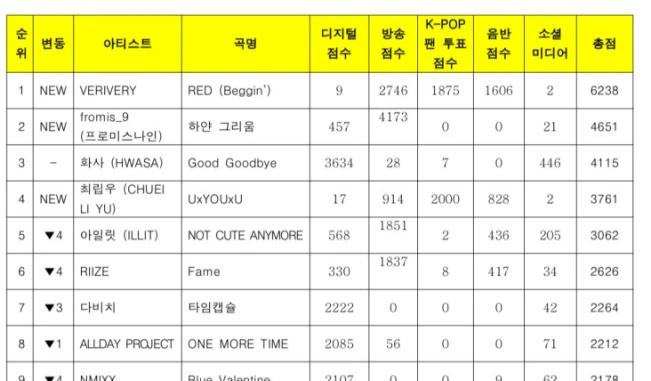 ミュージックバンクは12日、公式サイトを通じて、「12月第2週」のランキングを発表。それによると、「VeriVery」は、fromis_9などを抑えて、1位に輝きました。