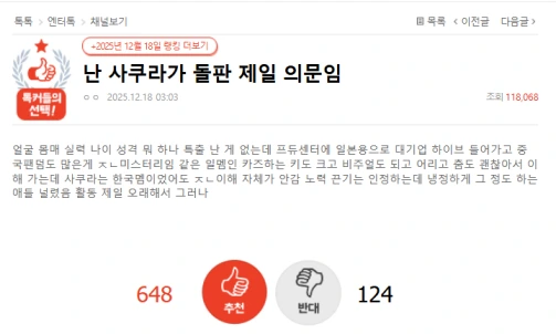 投稿主は「顔・スタイル顔、実力、年齢、性格、何一つ特別なものがない」と辛辣に指摘した上で、「なのにプデュセンターになった。日本市場のために、大企業HYBE入って、中国ファンダムも多いのが本当にミステリー」「日本人メンバーであるカズハは、背も高くてビジュアルも若く踊りも良くて理解できるが、咲良は韓国メンバーだったとしても理解不能」「努力根気は認めるが」と綴っている。