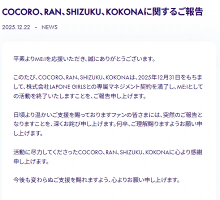 事務所ラポネは22日、「メンバーのココロ(加藤心)、ラン(石井蘭)、シヅク(飯田栞月)、ココナ(佐々木心菜)が、12月31日をもちまして、専属マネジメント契約を満了し、ME:Iとしての活動を終了する」と明らかにしました。