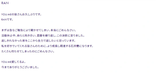 2025年7月から活動を休止していた、ラン(石井蘭)は「皆さんお久しぶりです」「まずは急なご報告により驚かせてしまい、本当にごめんなさい。活動休止中、自らと向き合い、葛藤を繰り返し、この決断に至りました」とし、「返しきれなかった恩をここから全力で返したいと思っています。私を好きでいてくれる皆さんのために、より成長し精進する石井蘭になります。たくさん待たせてしまったのにごめんなさい」と綴っています。