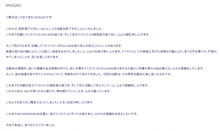 同じ事務所の男性アイドル「JO1大平祥生」との熱愛が発覚し活動を中断していた、飯田栞月は「このたび、契約満了に伴い、ME:Iとしての活動を終了することにいたしました」「自身の至らぬ行動により、ご心配とご迷惑をおかけしましたこと、心よりお詫び申し上げます。アイドルとしての自覚に欠けた未熟な行動により、多くの方を傷つけ、戸惑わせてしまったことを、深く反省しております」「自分自身の在り方やこれからについて、時間をかけて考えてきました。 今回の決断は、その熟考を重ねた末に至ったものです」。