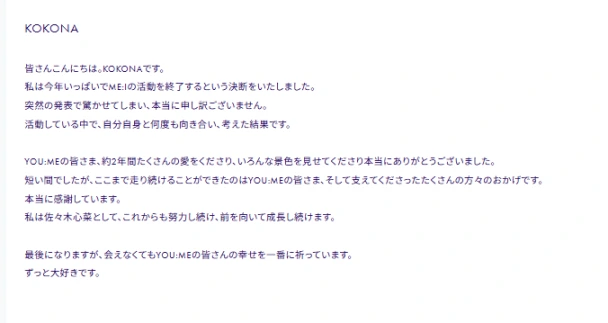 ココナ(佐々木心菜)は「私は今年いっぱいでME:Iの活動を終了するという決断をいたしました」「活動している中で、自分自身と何度も向き合い、考えた結果です」「約2年間たくさんの愛をくださり、いろんな景色を見せてくださり本当にありがとうございました」「私は佐々木心菜として、これからも努力し続け、前を向いて成長し続けます」。