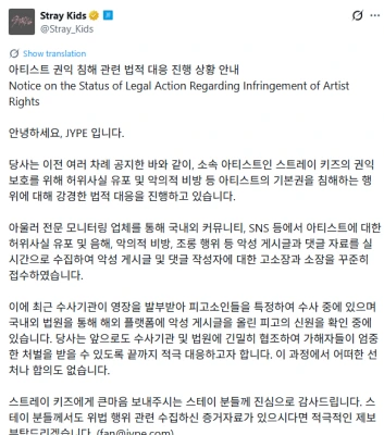 JYPエンターテインメントは27日、公式SNSを通じて「以前に数回公示したようにStray Kidsの権益保護のために、虚偽事実流布および悪意的誹謗など基本権を侵害する行為に対して強硬な法的対応を進めている」と明らかにしました。