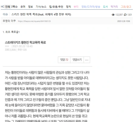 同日、韓国オンライン・コミュニティ(Theqoo)では「SKZヒョンジン校内暴力暴露(feat.被害者4人全員女性)」と題されたポストがトレンド入り。1300件もコメントが寄せられていた。今回の声明との関連性は、不明です。