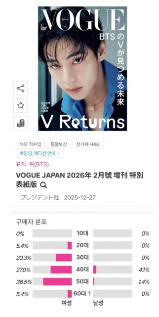 BTS「テヒョン」が、日本の雑誌「Vogue Japan」2月号の表紙に登場。韓国ECサイト上の、購入者属性情報が公開されています。