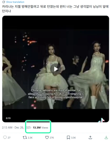 BTS「ジョングク」との熱愛説で注目を浴びる中、この映像はXで1300万ビューも再生されている。▶(ウィンター挨拶 → 観客シーン…ジョングク熱愛匂わせ影響? ニンニン・ジゼルには歓声 [SBS歌謡_])