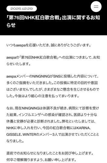 SMエンターテインメントは日本公式サイトを通じて、「ニンニンは体調不良が続き、病院にて診察を受けた結果、インフルエンザへの感染が確認」「医師より十分な休養と安静が必要と診断されました。弊社といたしましては、NHKに申し入れを行い、今回の紅白歌合戦にはカリナ、ジゼル、ウィンターのメンバー3人で出演させていただくこととなりました」と発表。