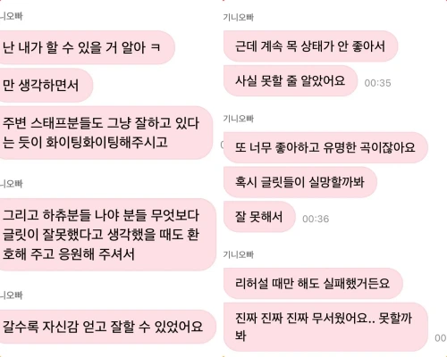 そんな中、本人はメッセージアプリを更新。それを暗に否定しています。ウォンヒは「実はプレッシャーもあって、うまくできるかとても心配していました」「3段高音はちょうど前日に成功していました。でも、ずっと喉の調子が悪くて、実はできないと思っていました」「もしかしたらグリットたちが失望するんじゃないかって、うまく歌えなくて。本当に怖かったです」と綴っています。