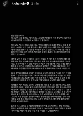 チャンジョは5日、「すでに知っている方々もいるだろうし、逆に知らなかったり驚いた方々もいると思うが、私は恋愛中だ」「私の人生に意味のある変化が生じれば、いつも皆さんに伝えたかった。この仕事を始めて16年が経った。活動をしながら感情的にメンタル的にも不安定な瞬間も多かった。そんな私の足りない姿を肯定的に変化させてくれたありがたい人」と、恋人の存在を明らかにしました。