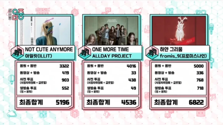 1月10日放送MBC「音楽中心」では、fromis_9「White Memories」, ILLIT「Not Cute Anymore」, Allday Project「One More Time」が1位候補にノミネート。このうち1位に輝いたのは、fromis_9!
