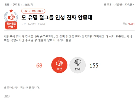 「有名K-POPガールズグループ」のエピソードが13日、韓国オンライン・コミュニティ(ネイトパン)に掲載。「性格悪い」との内容で、トレンド入りしています。