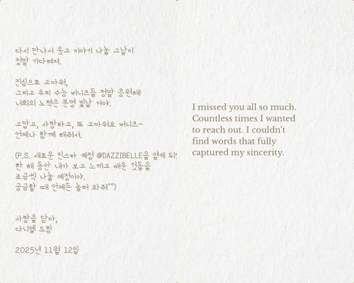 この手紙の後付には、「2025年11月12日」との日付が入っている。敗訴を受けて、メンバーたちがAdorへの復帰意思を明らかにした日です。 (NewJeans全員、Ador復帰へ!ダニエル,ミンジ,ハニも、ヘリン・ヘインに続く)