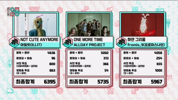 1月17日放送MBC「音楽中心」では、ILLIT「Not Cute Anymore」, Allday Project「One More Time」, fromis_9「White Memories」が1位候補にノミネート。このうち1位に輝いたのは、ILLIT!