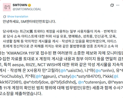 続けて「特にaespa、RIIZE、NCT WISHに対する上記のような悪質掲示物を持続的に掲示・作成してきたXユーザー計11ヶアカウントの確認された犯罪行為に対して、法務法人(世宗)と共に捜査機関に告訴状を提出した」「アップロードされた悪質掲示物も検討し、共に刑事告訴を準備しており、継続して告訴対象を拡大する予定」。