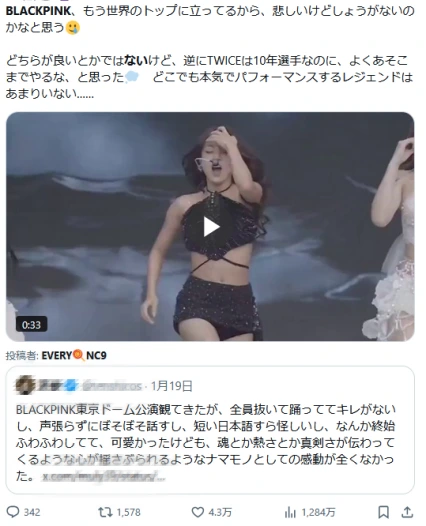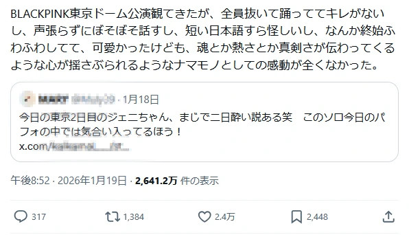 あるファンは「BLACKPINK東京ドーム公演観てきたが、全員抜いて踊っててキレがない」「声張らずにぼそぼそ話す」「短い日本語すら怪しいし、なんか終始ふわふわしてて、可愛かったけども、魂とか熱さとか真剣さが伝わってくるような心が揺さぶられるようなナマモノとしての感動が全くなかった」。
