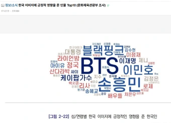 韓国に対する好感度に最も肯定的な影響を及ぼした要因としては、文化コンテンツ(45.2%)が最も多かった。その中で「韓国のイメージに肯定的な影響を与えた人物」では、「BTS」が1位(7.9%)となっています。