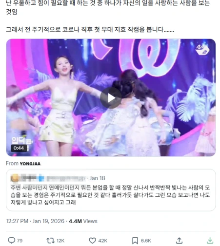これを最近アップしたXユーザーは「私は憂鬱で力が必要な時にすることの一つが、自分の仕事を愛する人を見ることだ」「それで私は定期的にコロナ直後の初舞台ジヒョの密着カメラを見ます」。このポストが「440万ビュー」を記録するなど、共感を呼んでいます。