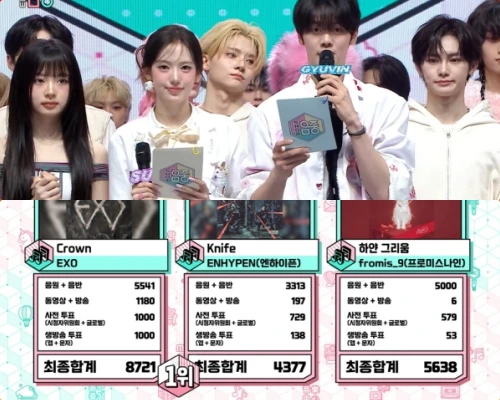1月31日放送MBC「音楽中心」では、EXO「Crown」, ENHYPEN「Knife」, fromis_9「White Memories」が1位候補にノミネート。このうち1位に輝いたのは、EXO!