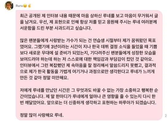 続けて「歌手になることは、練習生時代から私が夢見ていた目標でした。だからこそ、3年という時間を経て韓国デビュー決定の知らせを聞いた時、喜びよりも新しいステージに立つ準備ができているのか、待ってくださったファンの方々に成長した姿をお見せしなければならないという、私自身に対する責任感とプレッシャーが大きかった」「インタビューでそんな複雑だった私の本心をうまく整理してお話しできず、結果的に私が韓国活動を軽く考えたり過程としてだけ考えているとルネに感じさせてしまったようで、本当にごめんなさい」。
