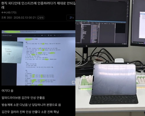 あるユーザーは13日、韓国オンライン・コミュニティに「現職PDだが、インスタ(Instiz)に認証しようとしたがうまくいかなかったのでここに書く」と書き込みました。