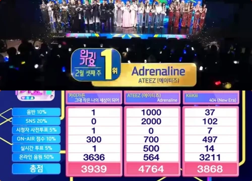 2月15日放送SBS「人気歌謡」では、ATEEZ「Adrenaline」, Car, the Garden「My Whole World」, KiiiKiii「404(New Era)」が1位候補にノミネート。このうち1位に輝いたのは、ATEEZ!
