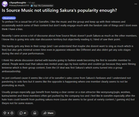 投稿主は「ソスがサクラを他のメンバーとおなじくらいプッシュしていないという、不満の声を最近目にする。私も分かるような気がして」「曲では、パートは少ないし、MVスクリーンタイムの少ない。日本曲でも。年末番組では、ソロステージもない」。